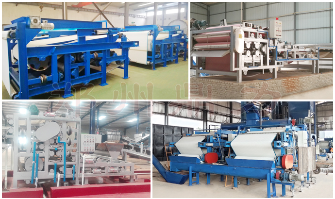 物料經(jīng)過(guò)輸送機(jī),輸送到脫水機(jī)的料斗中,經(jīng)過(guò)螺旋布料器均勻地鋪在濾帶上,濾帶隨著設(shè)備的運(yùn)行,限料板把料層高度刮平,使料的厚度完全均勻一致;然后上下兩條完全漲緊的環(huán)狀濾帶夾住料層,在驅(qū)動(dòng)輥帶動(dòng)下,脫水區(qū)內(nèi)的對(duì)輥連續(xù)多次機(jī)械擠壓,將大量的水份壓出。根據(jù)物料的特點(diǎn)自動(dòng)調(diào)節(jié)擠壓力,滿足客戶對(duì)物料水分要求。