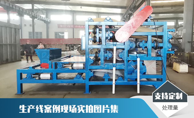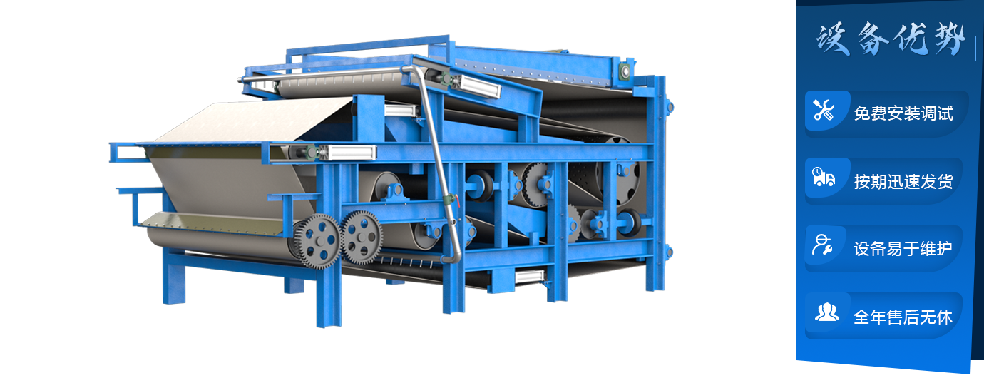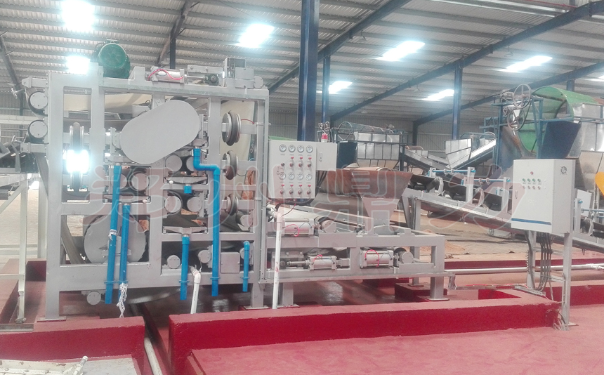 物料經(jīng)過輸送機(jī),輸送到脫水機(jī)的料斗中,經(jīng)過螺旋布料器均勻地鋪在濾帶上,濾帶隨著設(shè)備的運(yùn)行,限料板把料層高度刮平,使料的厚度完全均勻一致;然后上下兩條完全漲緊的環(huán)狀濾帶夾住料層,在驅(qū)動輥帶動下,脫水區(qū)內(nèi)的對輥連續(xù)多次機(jī)械擠壓,將大量的水份壓出。根據(jù)物料的特點(diǎn)自動調(diào)節(jié)擠壓力,滿足客戶對物料水分要求。