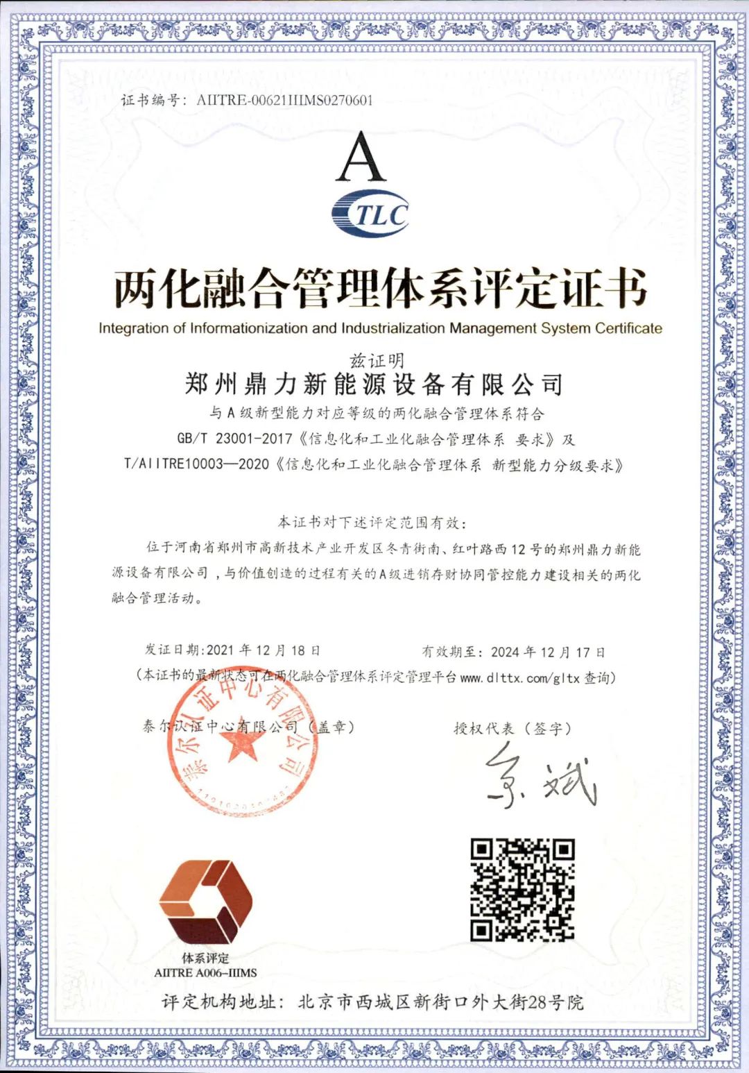 5、2021年12月鄭州鼎力榮獲兩化融合管理體系評(píng)定證書